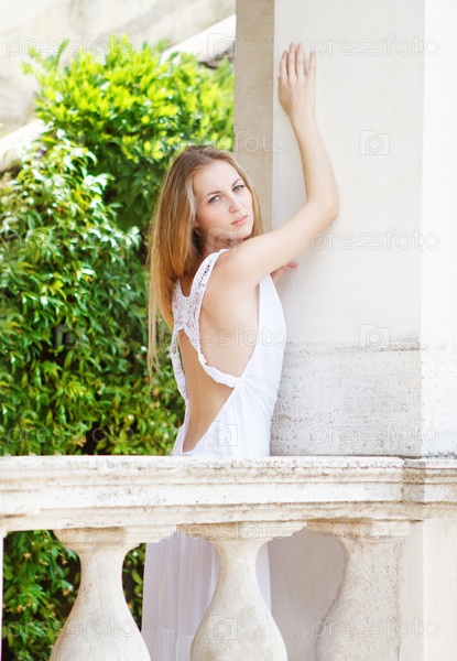 Девушка в длинном белом платье в летний день