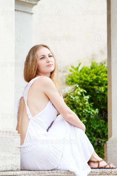 Блондинка в длинном белом платье