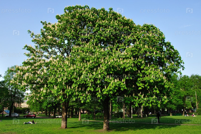 парк дерево каштан цветущий соцветия листва люди машины зеленый