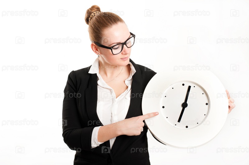 Деловая женщина с часами на светлом фоне