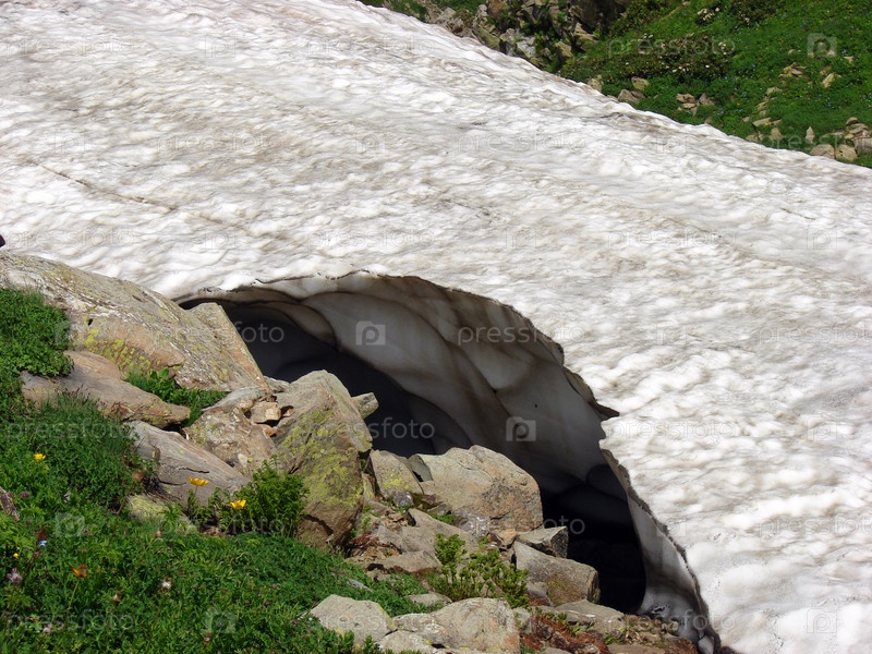 Крупный кусок снега, оставшийся летом на горе Ачишхо, Сочи, Красная Поляна