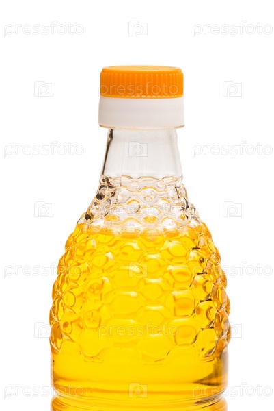 Бутылка с подсолнечным маслом на белом фоне