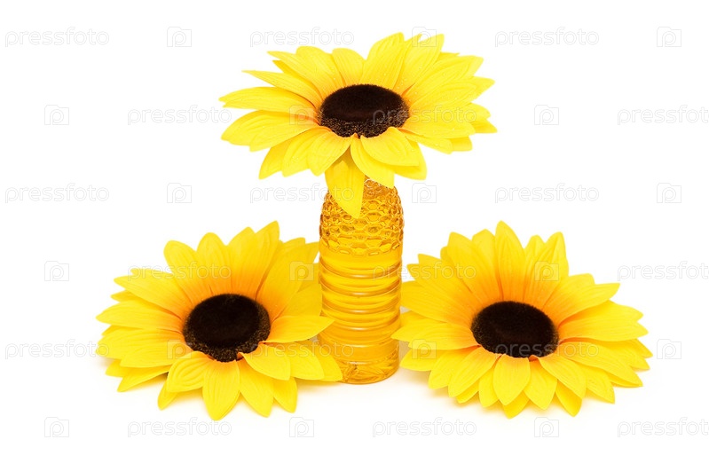 Три подсолнуха и бутылка с маслом на белом фоне