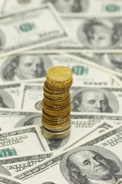 Стопка монет и долларовые банкноты