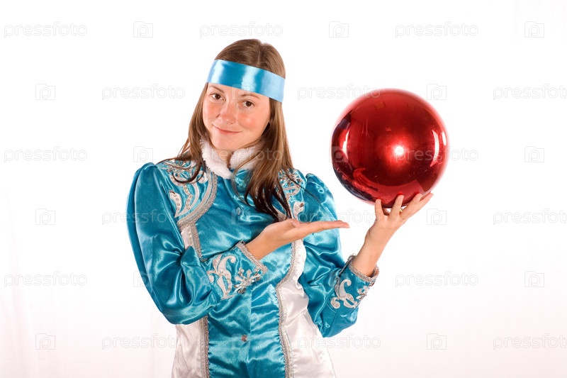 Девушка в этническом костюме с большим красным шаром в руках