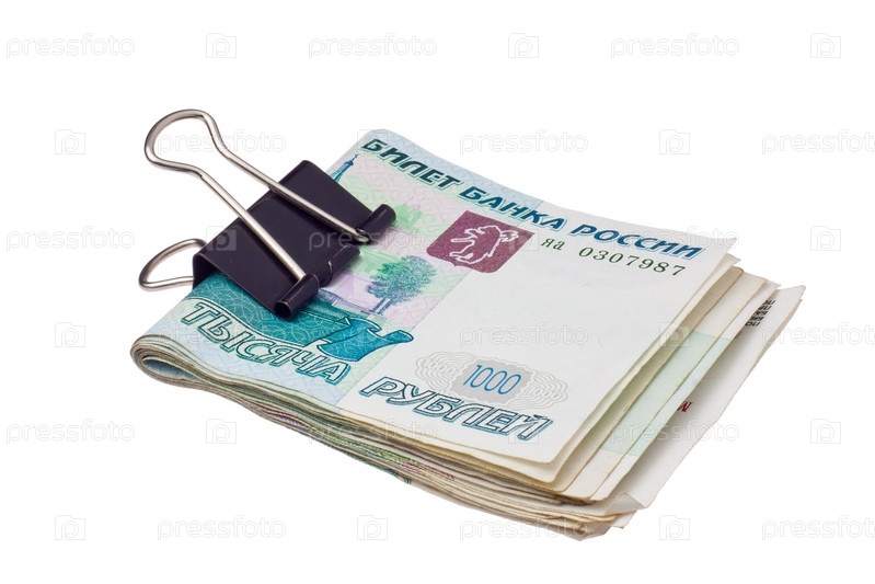 Пачка российских денег в зажиме на белом фоне