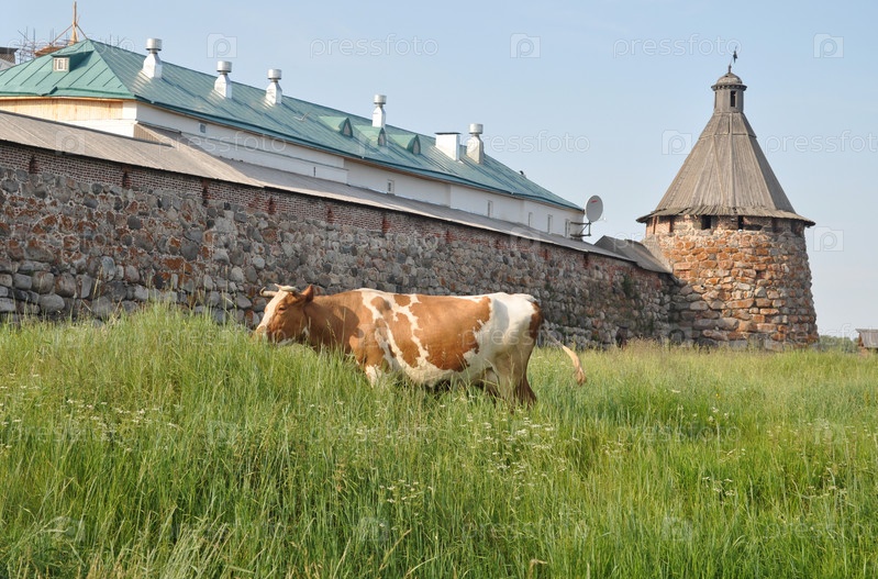 Корова, пасущаяся возле стены Соловецкого монастыря, неподалеку от Святого озера