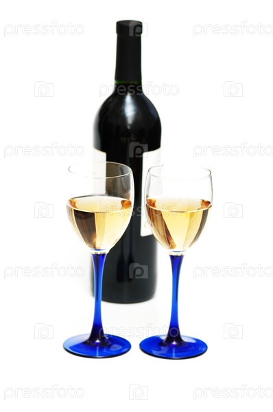 Два бокала белого вина и бутылка, изолированные на белом фоне