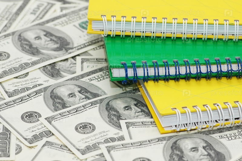 Разноцветные тетради и долларовые банкноты крупным планом