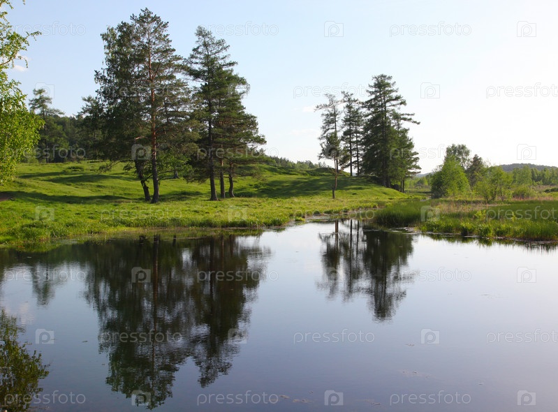 Весенний пейзаж с березами и соснами, водой и отражением