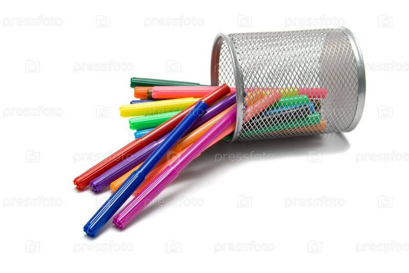 Стакан с фломастерами на белом фоне