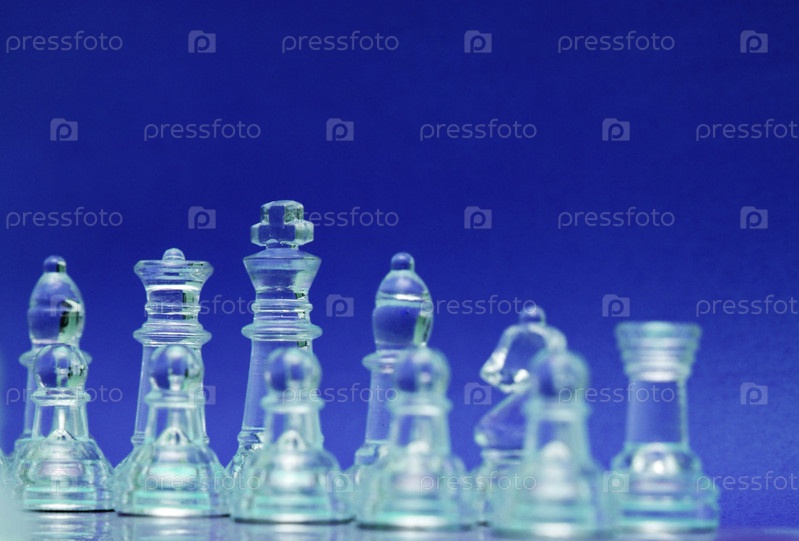 Стеклянные шахматные фигуры на голубом фоне