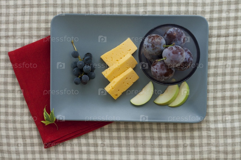 Сыр и фрукты в тарелке с красной салфеткой