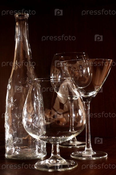 Натюрморт из хрустальных бокалов и бутылок на темном фоне