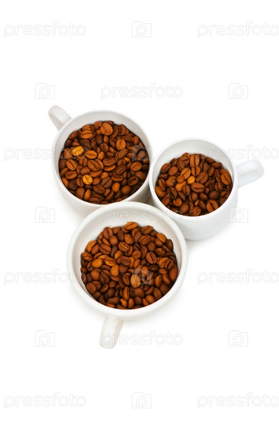 Три белых чашки, полные кофейных зерен