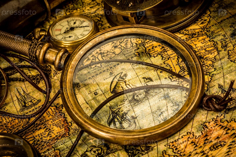 Винтажное увеличительное стекло лежит на карте древнего мира