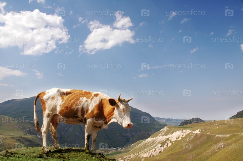 Коричневая с белыми пятнами корова в горах летом