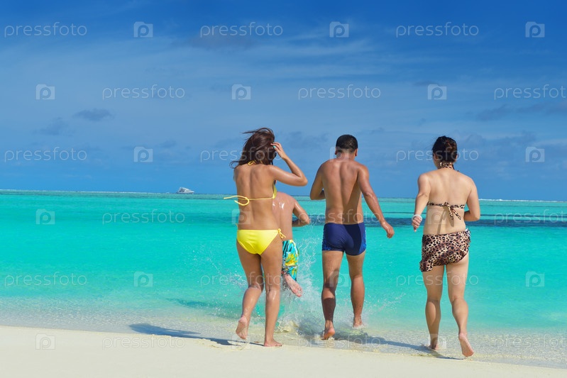 Группа счастливых молодых людей веселится на пляже