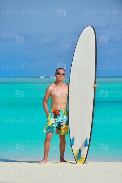 Мужчина с доской для серфинга на пляже