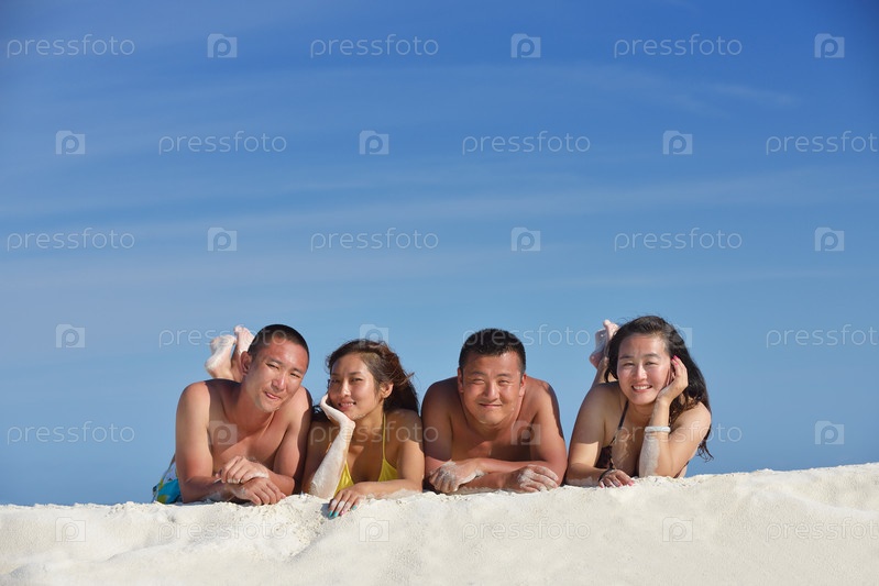 Группа счастливых молодых людей веселится на пляже