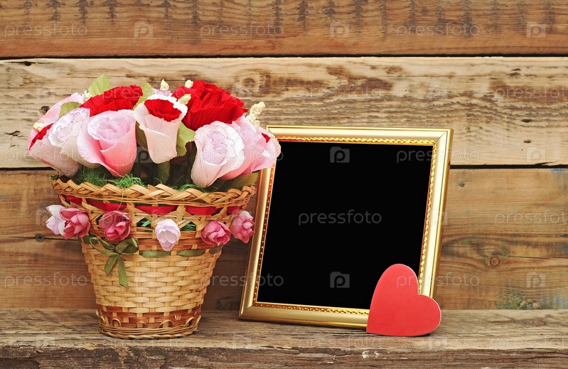 Букет бумажных цветов в корзине и пустая фоторамка