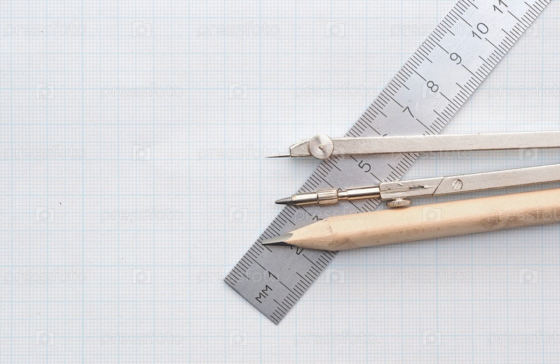 Геометрический набор с циркулем, карандашом и линейкой на миллиметровой бумаге