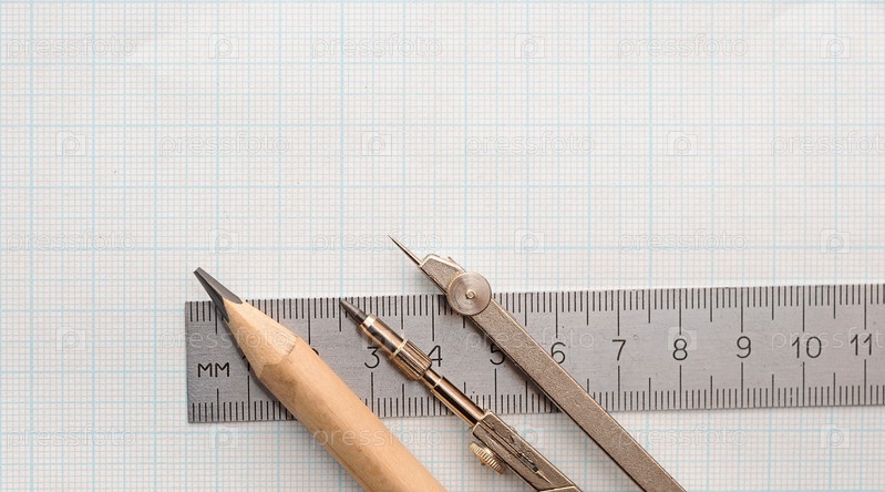 Инженерный набор с циркулем, карандашом и линейкой на миллиметровой бумаге