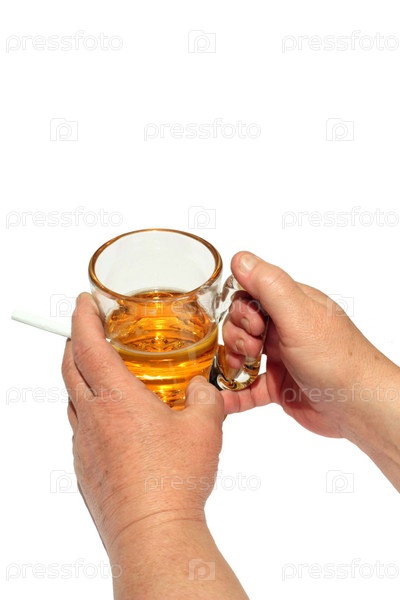 Кружка с пивом в руках на белом фоне