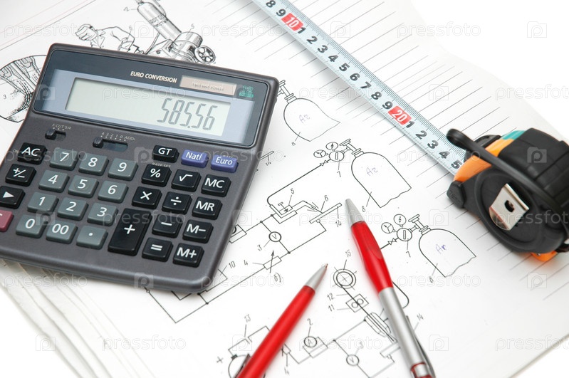 Конструкторские чертежи, калькулятор, ручки и измерительная лента