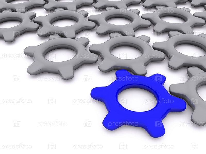 Серый и синий шестерени в 3d на белом фоне