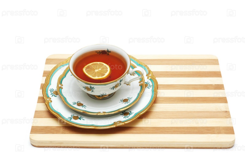 Чашка чая с лимоном на дощечке, изолированная на белом фоне