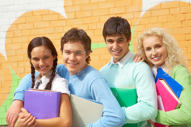 Группа молодых людей на фоне разрисованной кирпичной стены