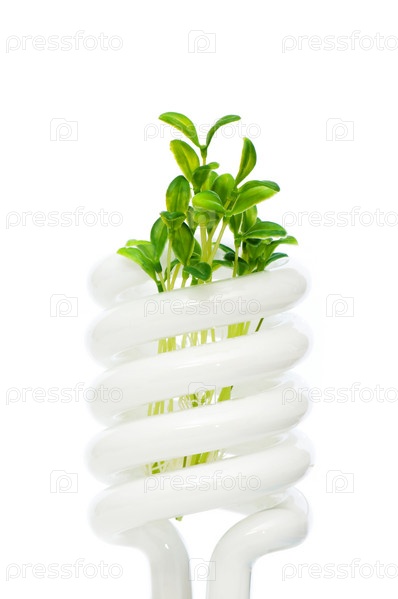 Энергосберегающая лампа с зеленой рассадой, изолированная на белом фоне