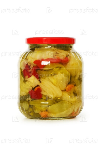 Банка с соленьями, изолированная на белом фоне
