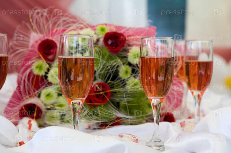 Свадебный букет и бокалы вина на столе
