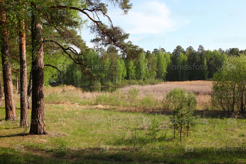 Весенний пейзаж с березами и соснами