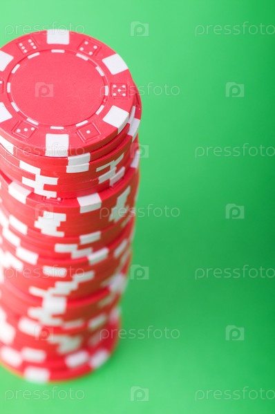 Стопка красных фишек казино на зеленом фоне
