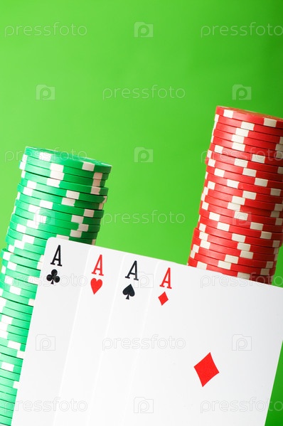 Игральные карты и фишки казино на зеленом фоне