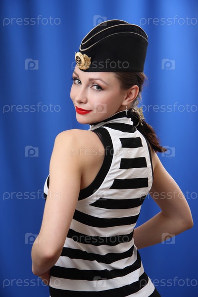Девушка в полосатой майке и морской пилотке на синем фоне
