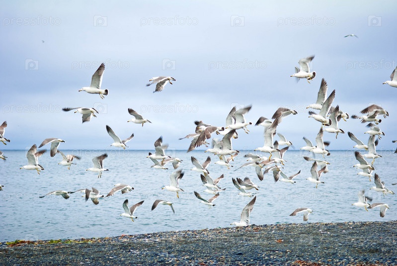 Множество чаек на берегу моря