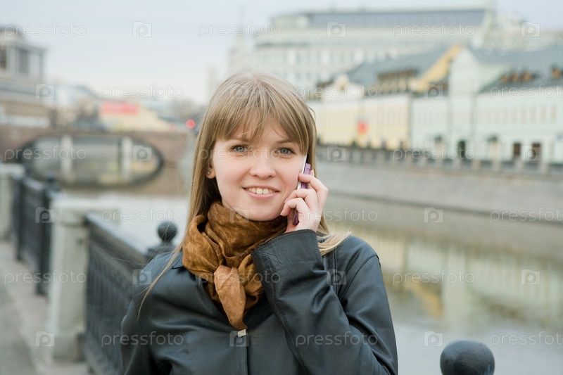 Портрет улыбающейся девушки, говорящей по телефону
