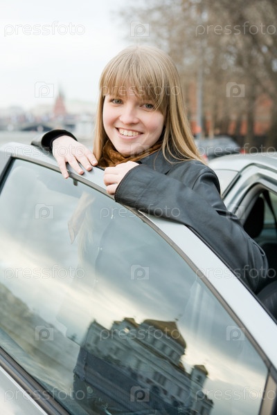 Портрет светловолосой девушки, выходящей из машины