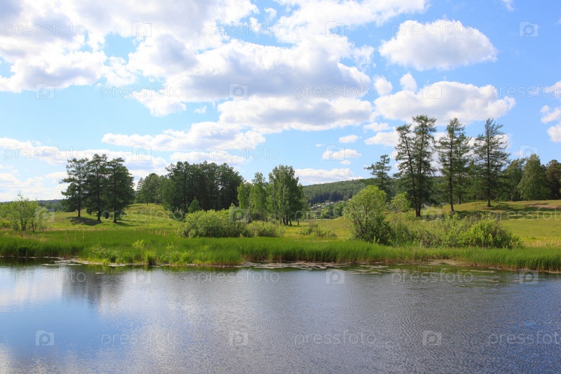 Водоем среди зеленых деревьев