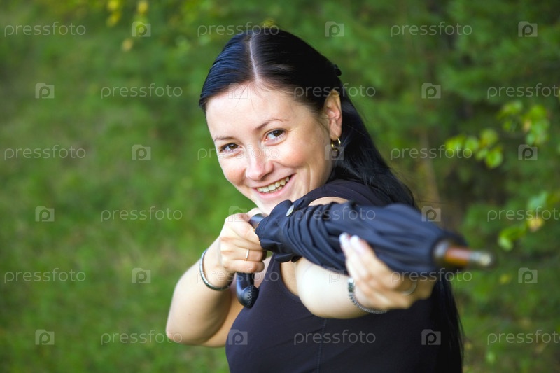 Молодая женщина с зонтом на фоне травы