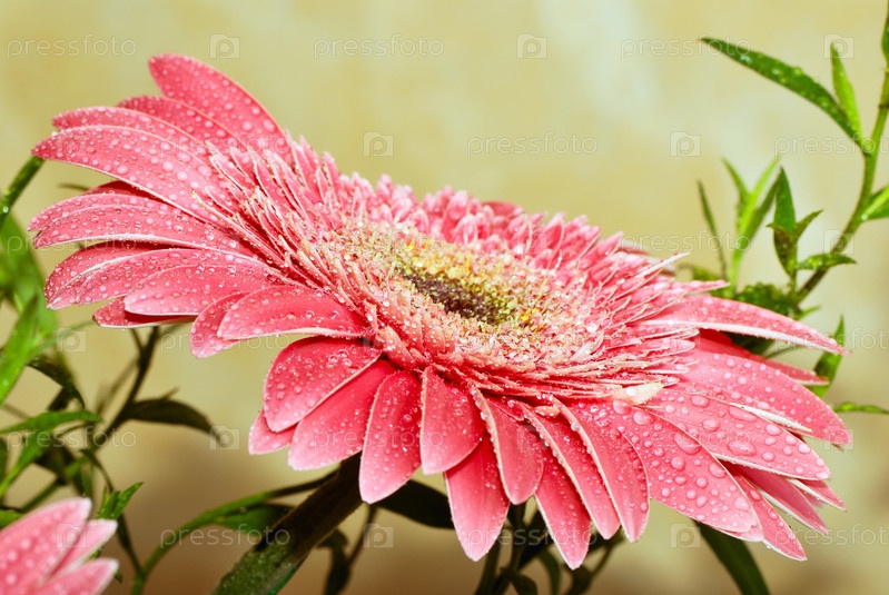 Розовая гербера с каплями воды крупным планом