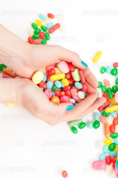 Яркие конфеты и женские руки на белом фоне