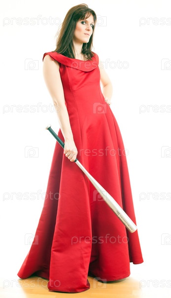 Красивая женщина в длинном красном платье стоит на белом фоне и держит металлическу бейсбольную биту