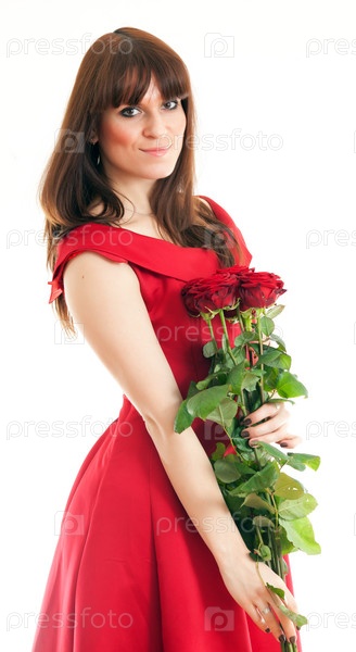 Красивая молодая женщина в длинном красном платье стоит на белом фоне и держит красные розы
