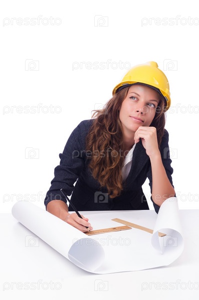 Архитектор с чертежами на белом фоне