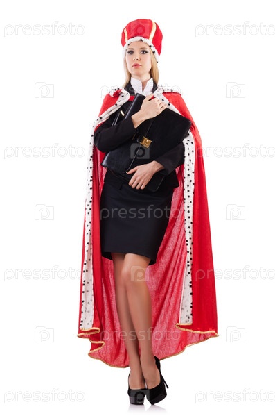 Бизнес-леди в королевском наряде, изолированная на белом фоне